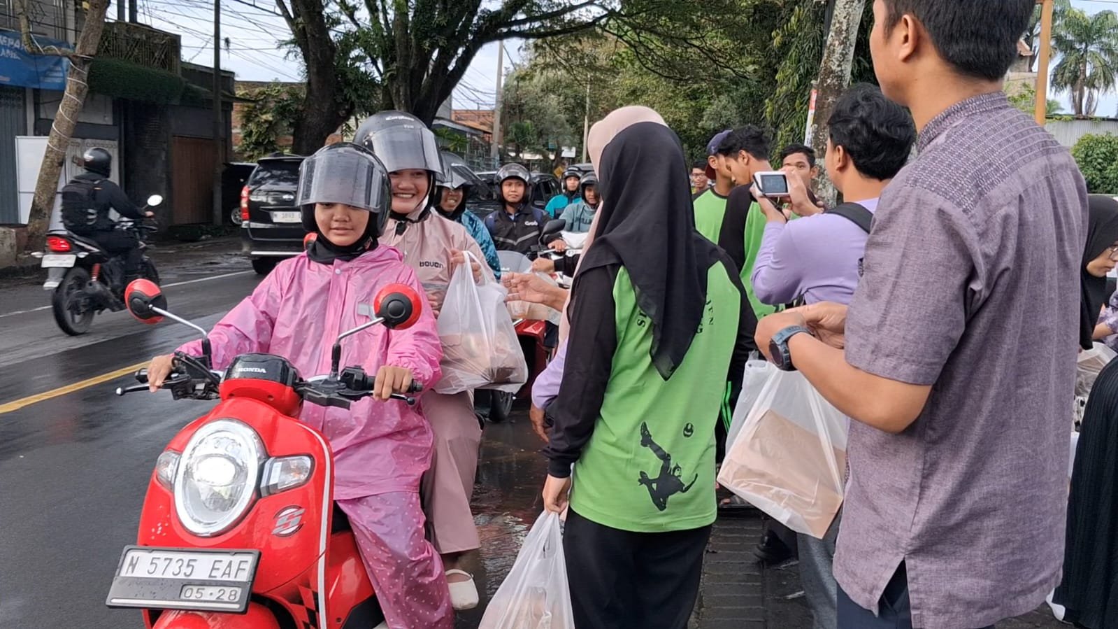 Empat staf Kemenag turun langsung. Menyatu di tengah hujan. Menyapa pengguna jalan. Mendampingi anak-anak berbagi.