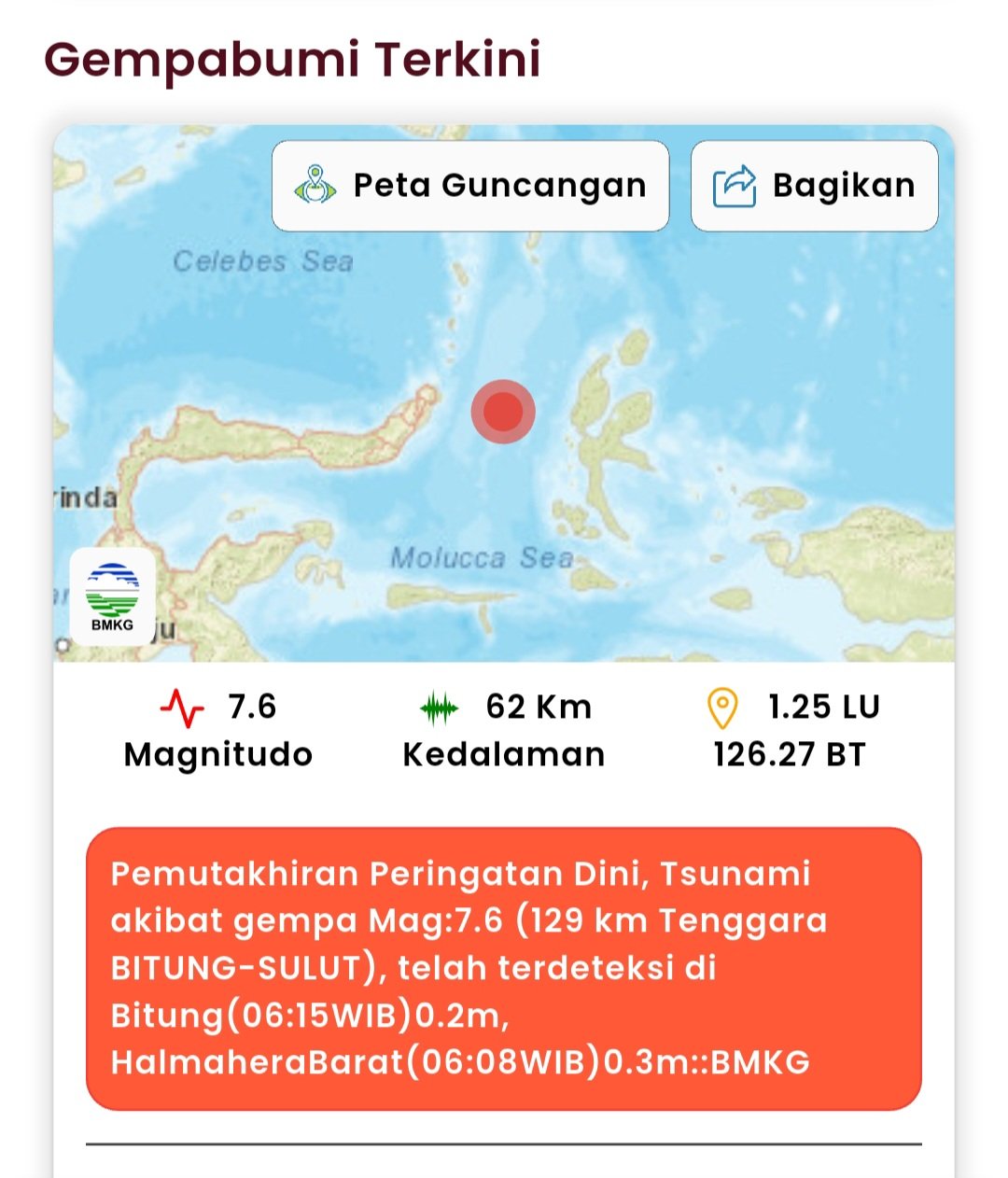 Berdasarkan data BMKG, gempa terjadi pada koordinat 1,25 Lintang Utara dan 126,27 Bujur Timur, dengan kedalaman 62 kilometer.