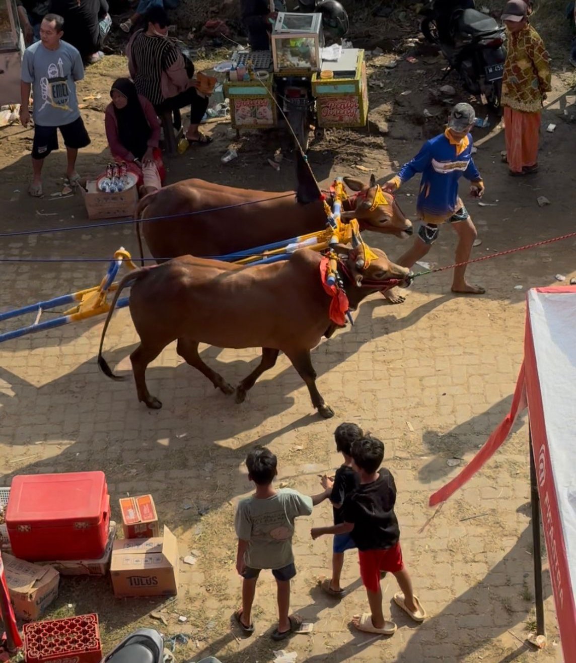 Minggu, 14 Desember 2025 hari kedua kerapan sapi diperuntukkan bagi pasangan sapi yang masih tergolong “junior” biasa disebut “kelas ukuran”, berlomba 80 pasang sapi.